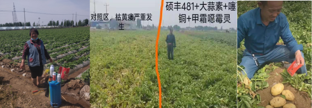 競(jìng)雙500倍+碩豐481+噻霉酮+甲霜惡霉靈防治土豆枯黃萎病1個(gè)月后,土豆健康生長(zhǎng),葉片厚綠,死苗少。