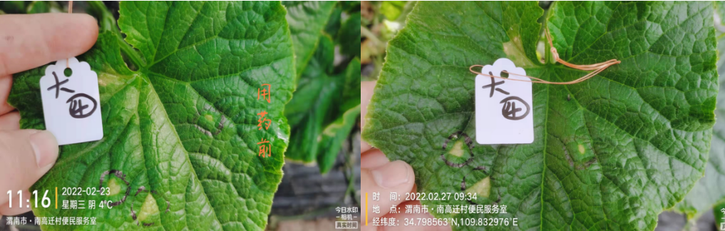 競(jìng)雙750倍+2%春雷霉素750倍防治黃瓜細(xì)菌性角斑病,4條后病斑得到抑制未見擴(kuò)散。